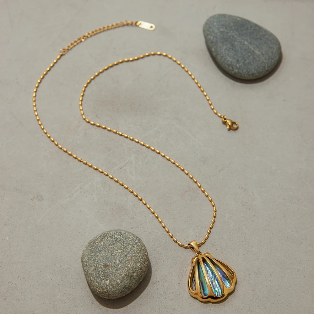 Nosso colar é confeccionado em aço inoxidável banhado a ouro, resistentes, à prova d’água e com o brilho inconfundível da madrepérola Abalone.