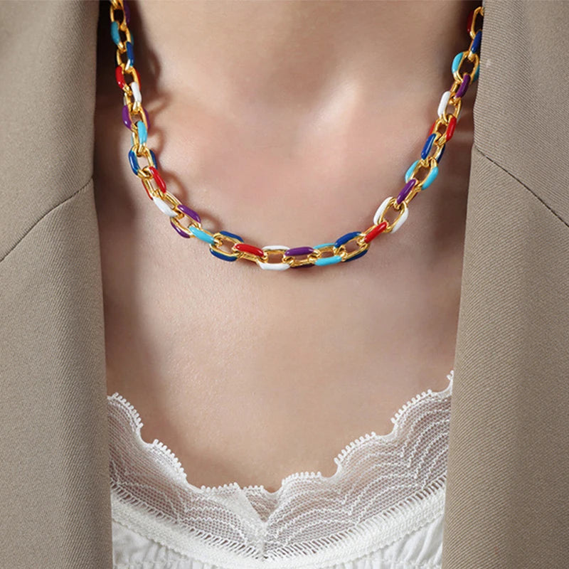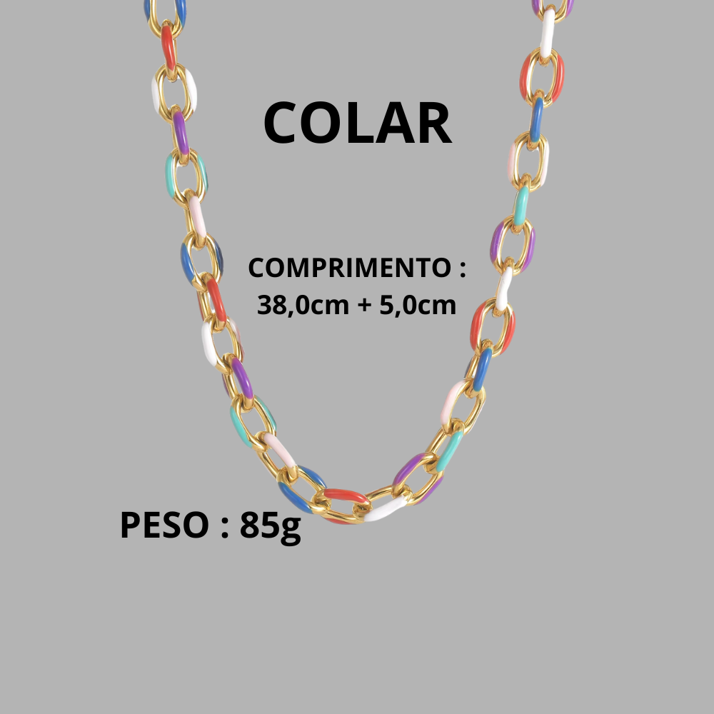 🌈 Os detalhes coloridos nos elos são o charme que transforma qualquer produção básica em um visual cheio de personalidade e estilo.