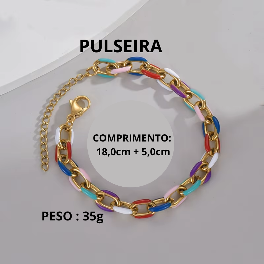 Este conjunto de colar e pulseira em aço inoxidável foi criado para mulheres que se amam. Com elos robustos e sofisticados, cada detalhe ganha vida através de cores vibrantes que tornam uma peça única, moderna e irresistível.
